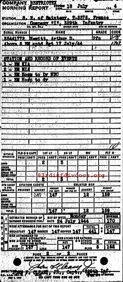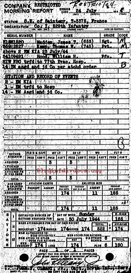 | Sergeant Madden was a member of I Company. The morning report for July 18, 1944 on page 42 and 43 show his promotion from Private First Class to Sergeant on July 17, 1944. Page 65, for July 24, 1944 shows him killed in action on July 23, 1944. General Order 23 lists his commendation for a Purple Heart for wounds received in action on July 10, 1944. |