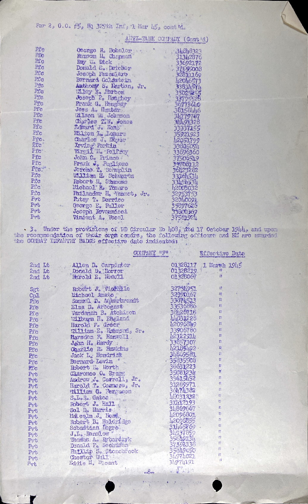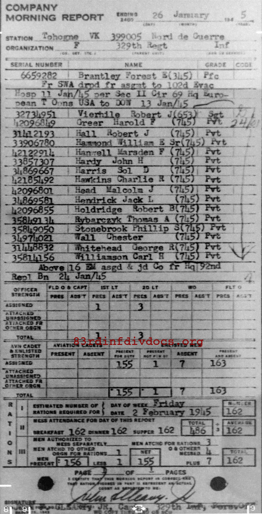 | 1945-01-26 | PVT | Assigned and joined from 92nd Replacement Battalion as of January 24, 1945 | 745 | F / 329 | view page |
