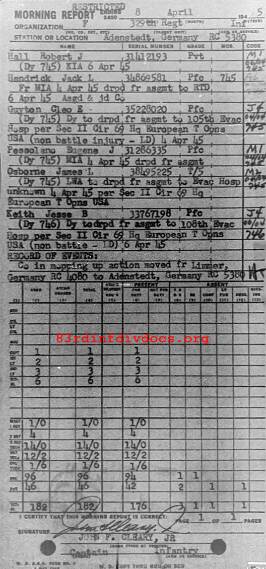 | Unit | 329th Infantry Regiment, 83rd Infantry Division |