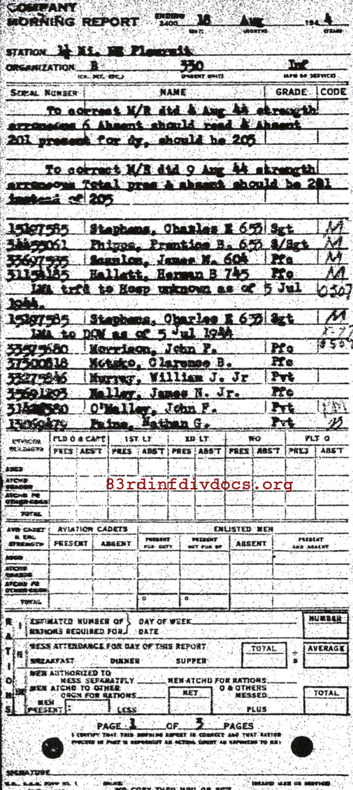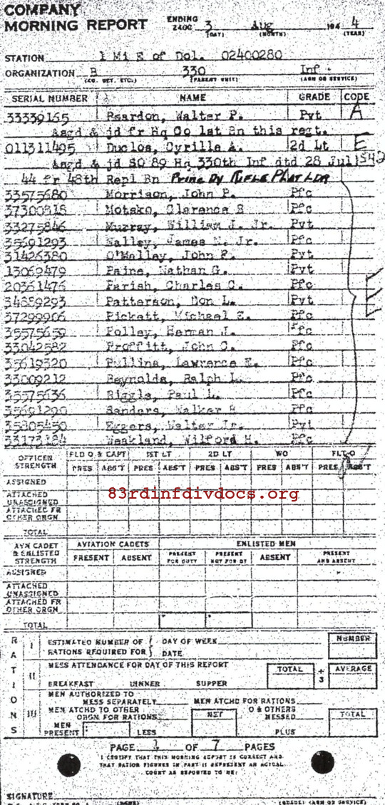 | 1944-09-04 | PVT | Erroneously asgd and jd 3 Aug 44 - Already picked up as of July 27, 1944, which corrects MR of August 18, 1944 | B / 330 | view page | |