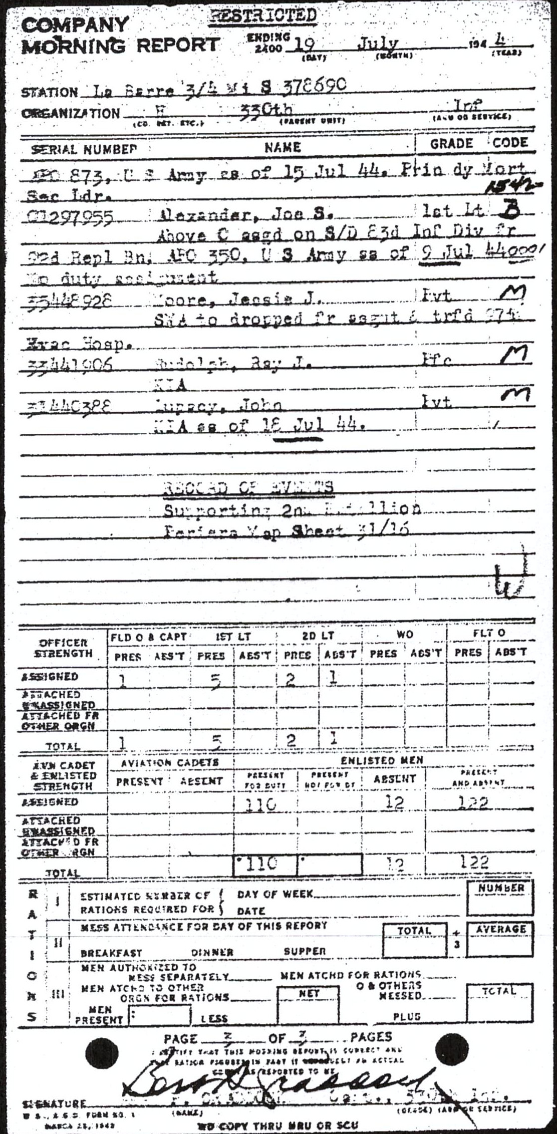 | Private Lupucy was a member of H Company. The morning report for July 10, 1944 on page 12 lists him joining the unit from the 92nd Replacement Battalion on July 8, 1944. Page 29, for July 19, 1944, lists him as killed in action on July 18, 1944. The pages can be seen below. |