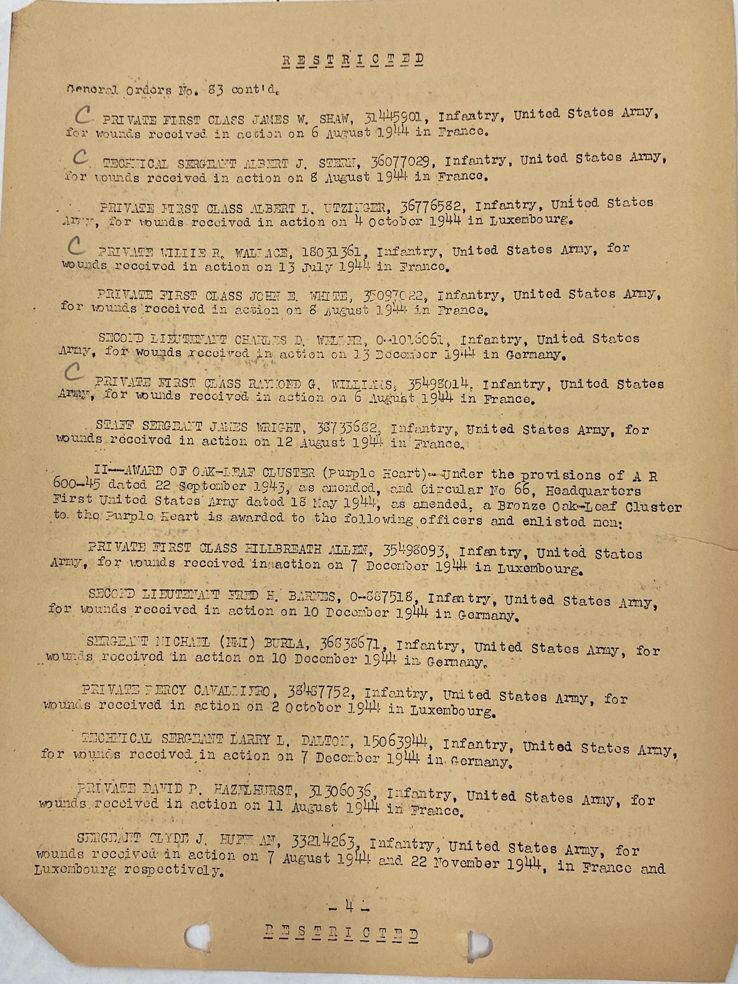 | 1945-01-17 | PFC | Killed in action on January 12, 1945, which corrects MR of January 15, 1945 | 675 | C / 330 | view page |