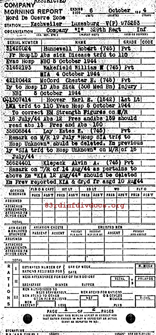 | Private Wakefield was a member of I Company. The morning report for October 6, 1944 on page 6 lists him as missing in action on October 4, 1944. The page can be seen below. |