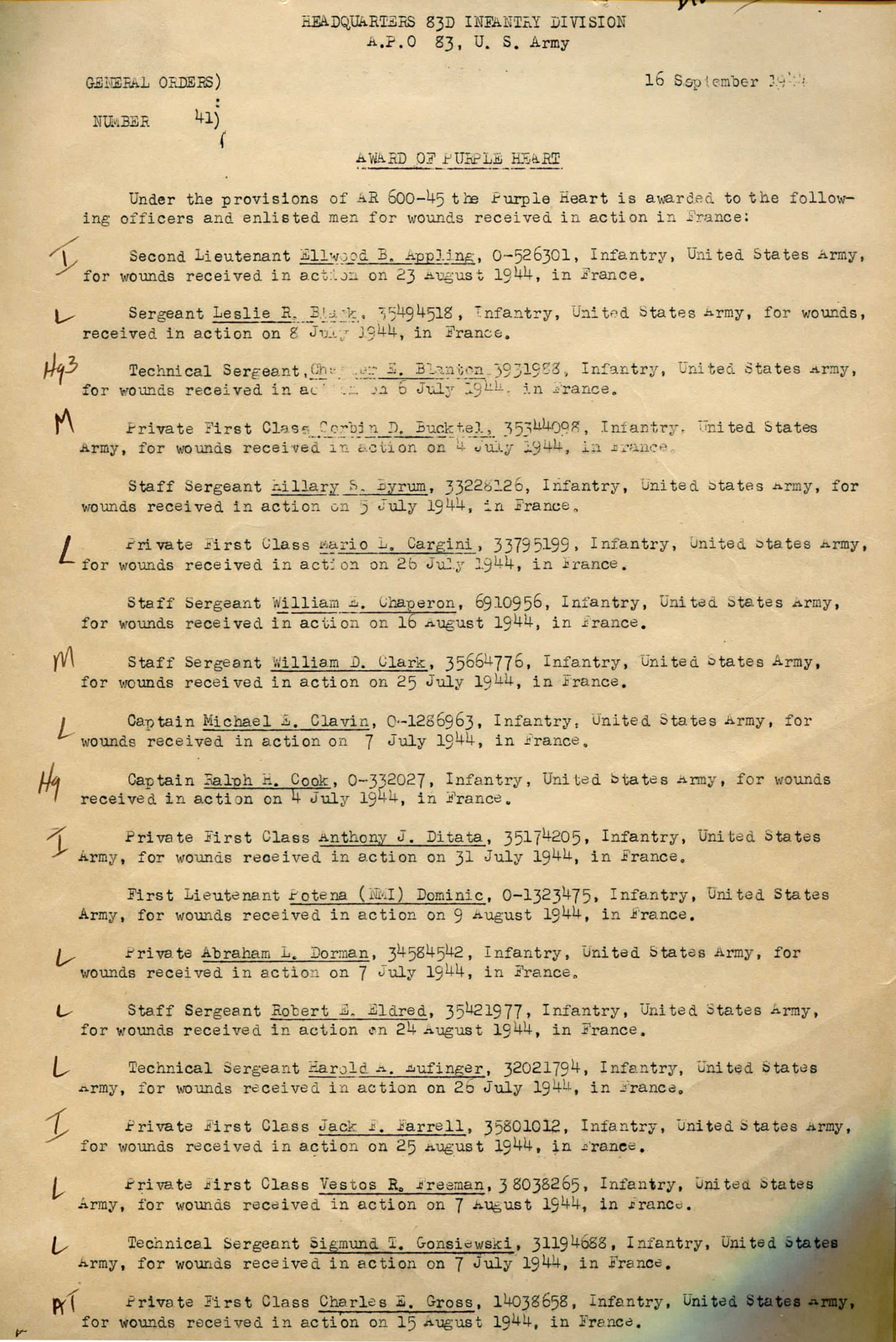 | Listed in 330th Infantry Regiment Casualties and Awards as wounded in action as a Technical Sergeant in 330. | 20 | ||||