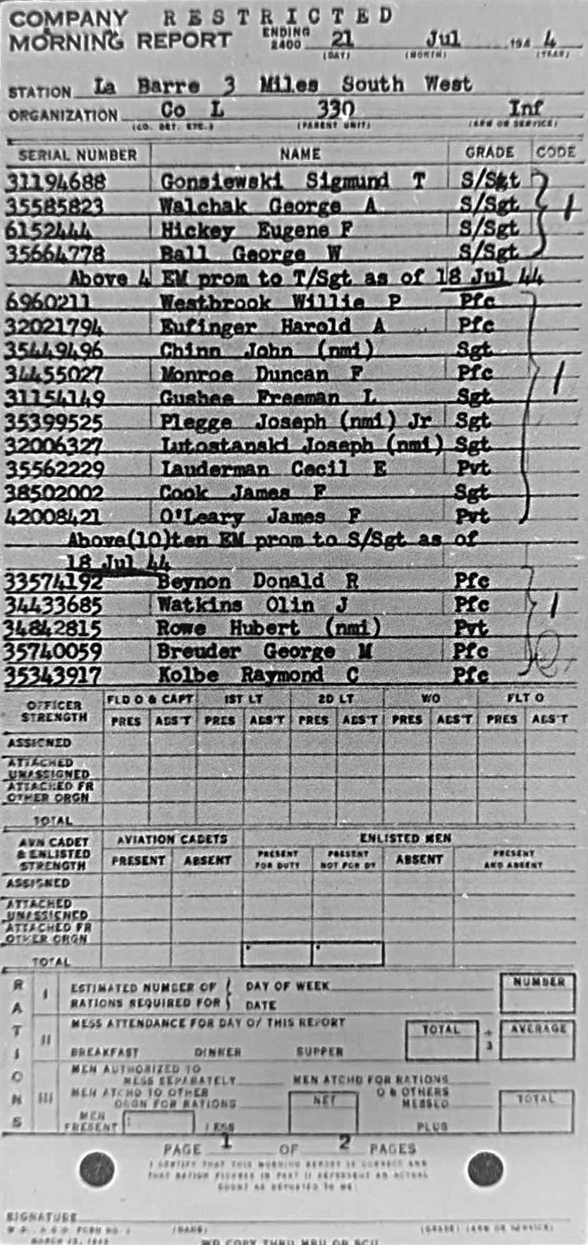 | 1944-07-21 | PFC | Promoted to Staff Sergeant as of July 18, 1944 | L / 330 | view page | |