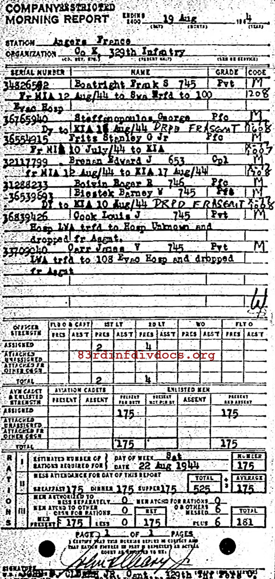 | Corporal Brenan was a member of K Company. The morning report for August 16, 1944 on page 30 lists him as missing in action on August 12, 1944. Page 45, for August 19, 1944 lists his status changed from missing in action to killed in action on August 17, 1944. All relevant pages can be seen below. |