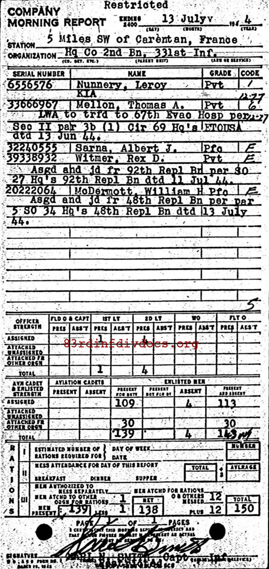 | 1944-07-15 | PFC | Killed in action on July 15, 1944 | HQCO2BN / 331 | view page | |