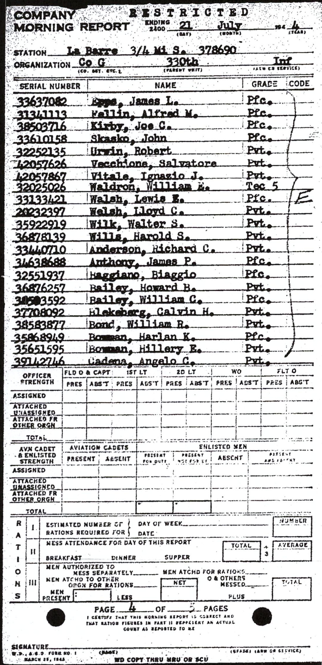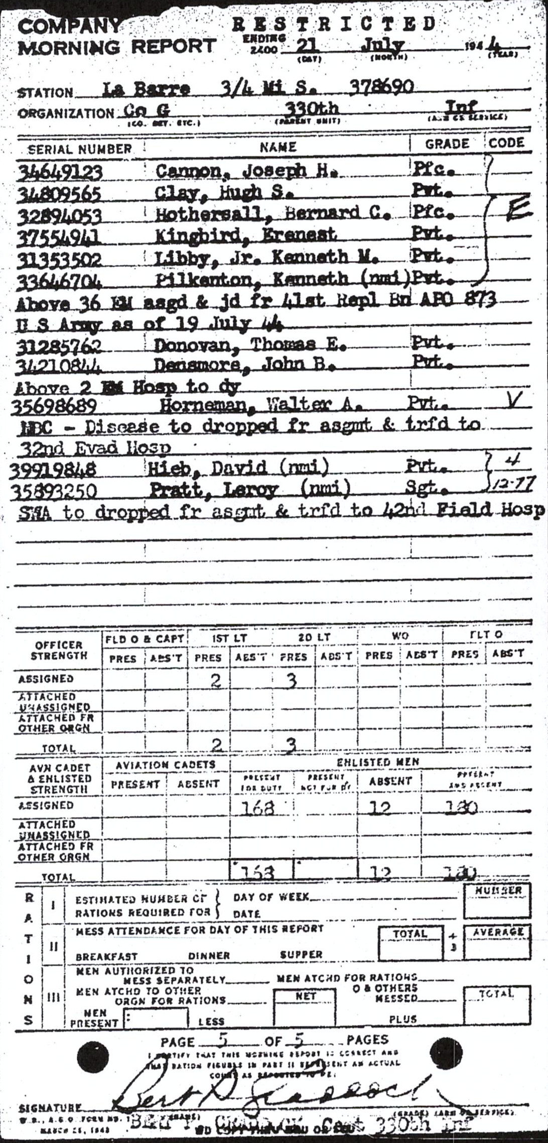 | 1944-07-21 | PVT | Assigned and joined from 41st Replacement Battalion as of July 21, 1944 | G / 330 | view page | |