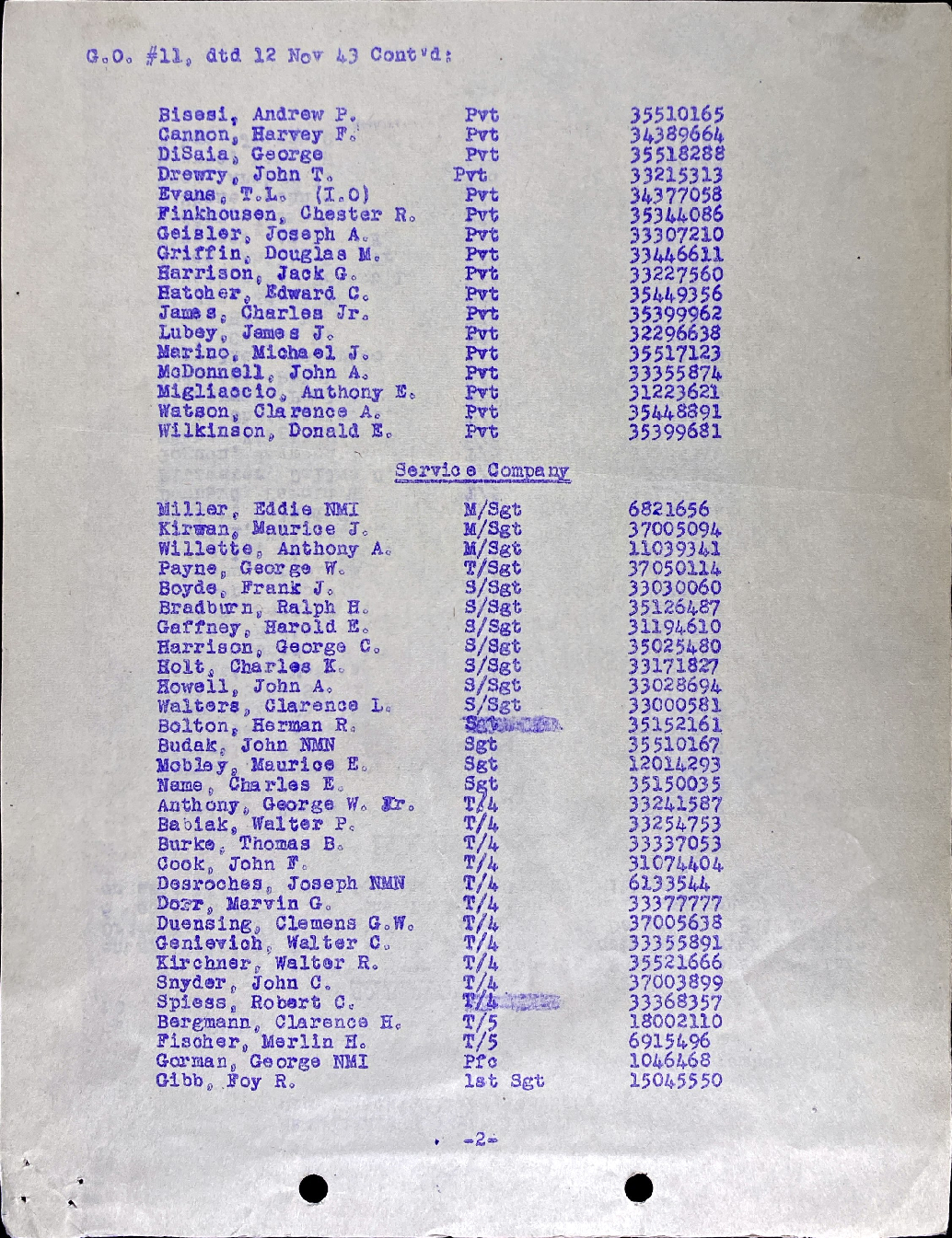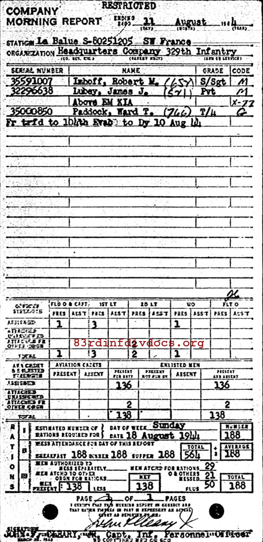 | 1944-08-11 | PVT | Killed in action on August 11, 1944 | 521 | HQCO / 329 | view page |