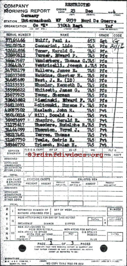 | 1944-12-23 | PFC | Assigned and joined from 92nd Replacement Battalion as of December 21, 1944 | 745 | K / 330 | view page |