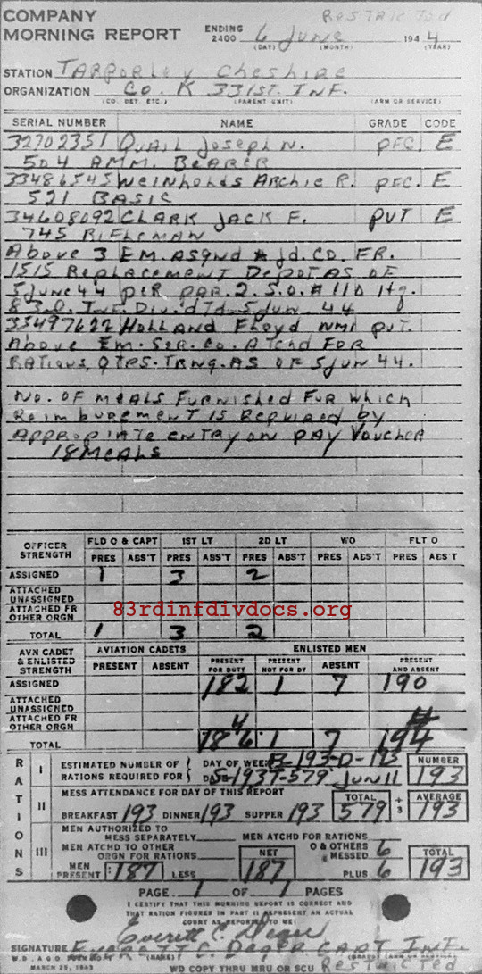 | 1944-06-06 | PFC | Assigned and joined from unknown unit as of June 5, 1944 | 504 | K / 331 | view page |