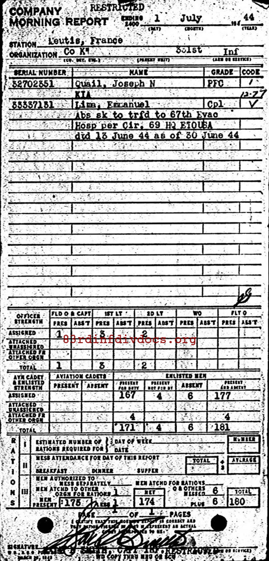 | Private First Class Quail was a member of K Company. The morning report for July 1, 1944 on page 1 lists him as killed in action. The page can be seen below. The IDPF of Joseph N Quail can be downloaded here. |