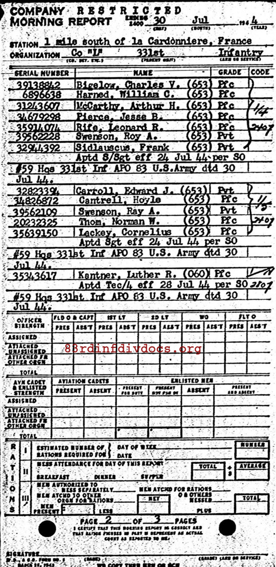 | 1944-07-30 | PVT | Promoted to Sergeant, duty changed to Squad Leader (653) as of July 24, 1944 | L / 331 | view page | |
