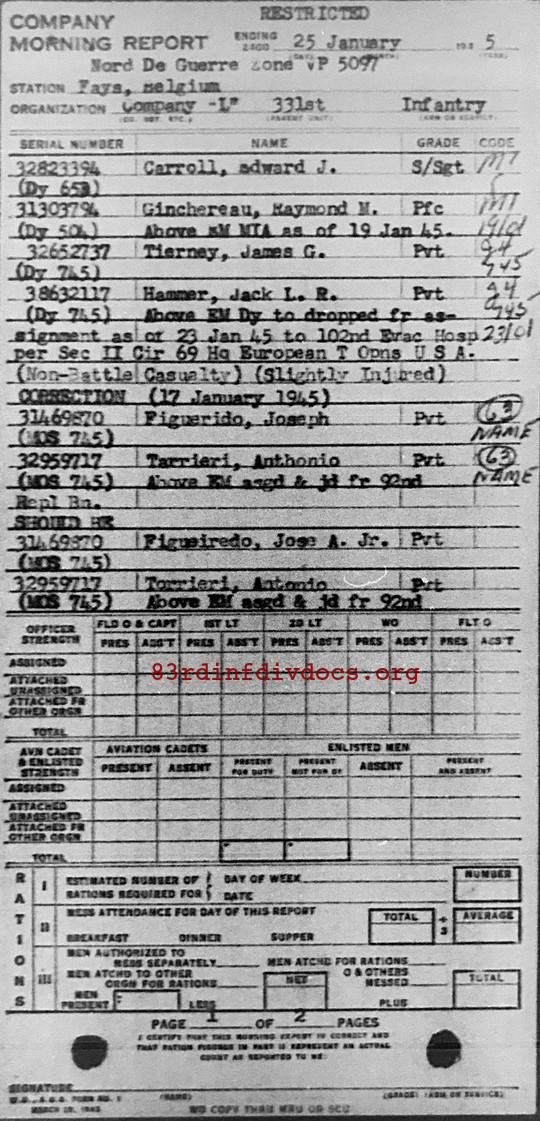 | Staff Sergeant Carroll was a member of L Company. The morning report for July 14, 1944 on page 20 show him joining L Company from the 92nd Replacement Battalion. Page 48, for July 30, 1944, of the same morning shows his promotion to Staff Sergeant on July 24, 1944 per Special Order #59. The pages can be seen below.