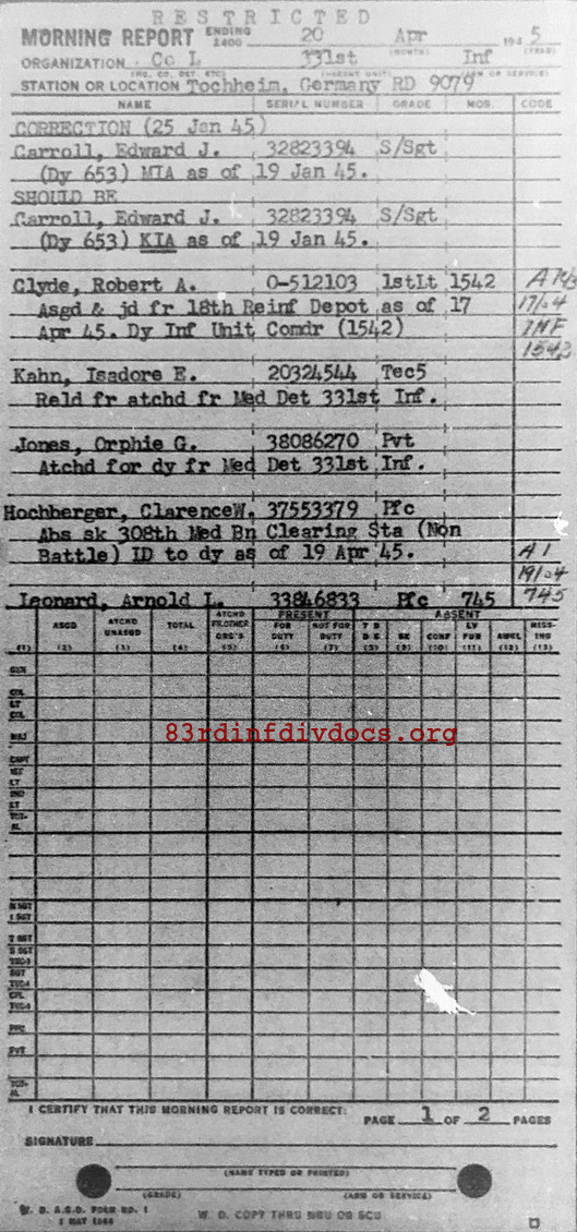 | 1945-04-20 | SSGT | Killed in action on January 19, 1945, which corrects MR of January 25, 1945 | 653 | L / 331 | view page |