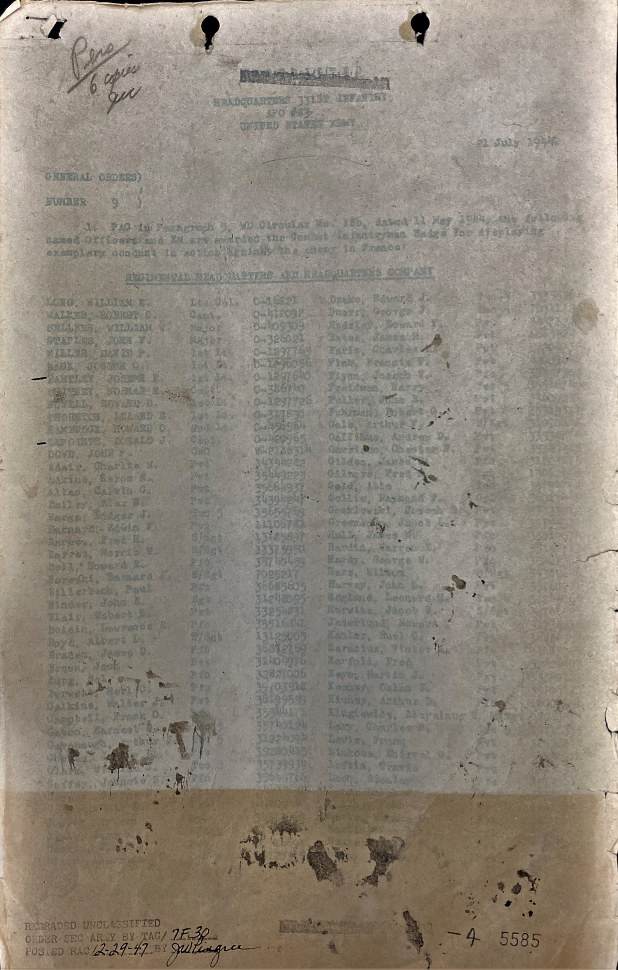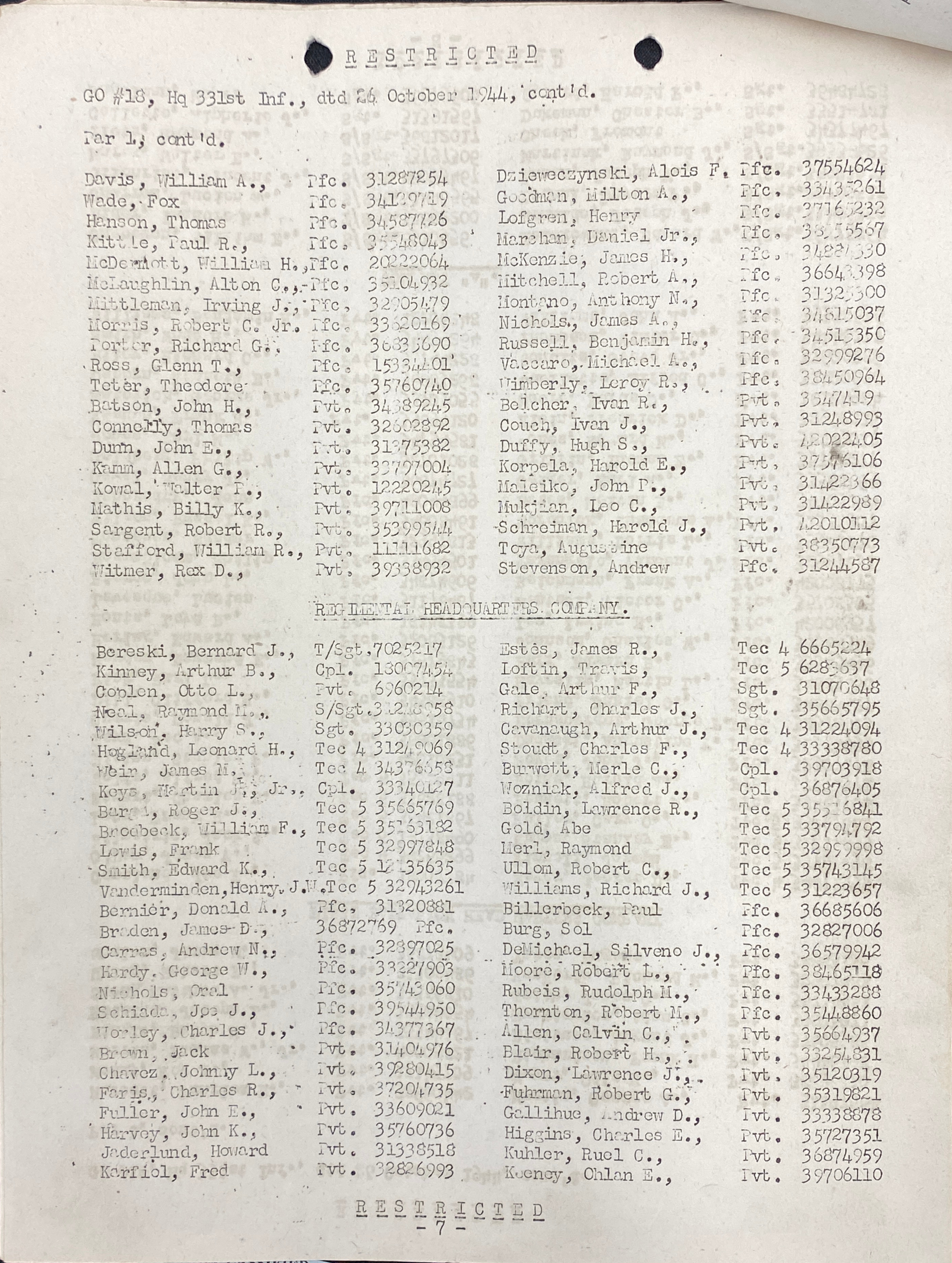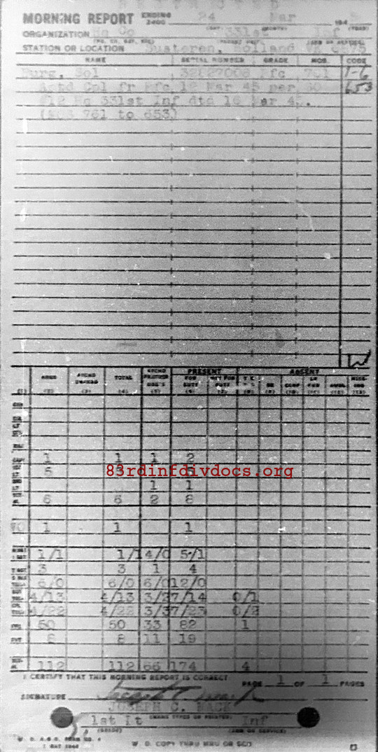 | 1945-03-24 | PFC | Promoted to Corporal, duty changed to Squad Leader (653) as of March 12, 1945 | 761 | HQCO / 331 | view page |