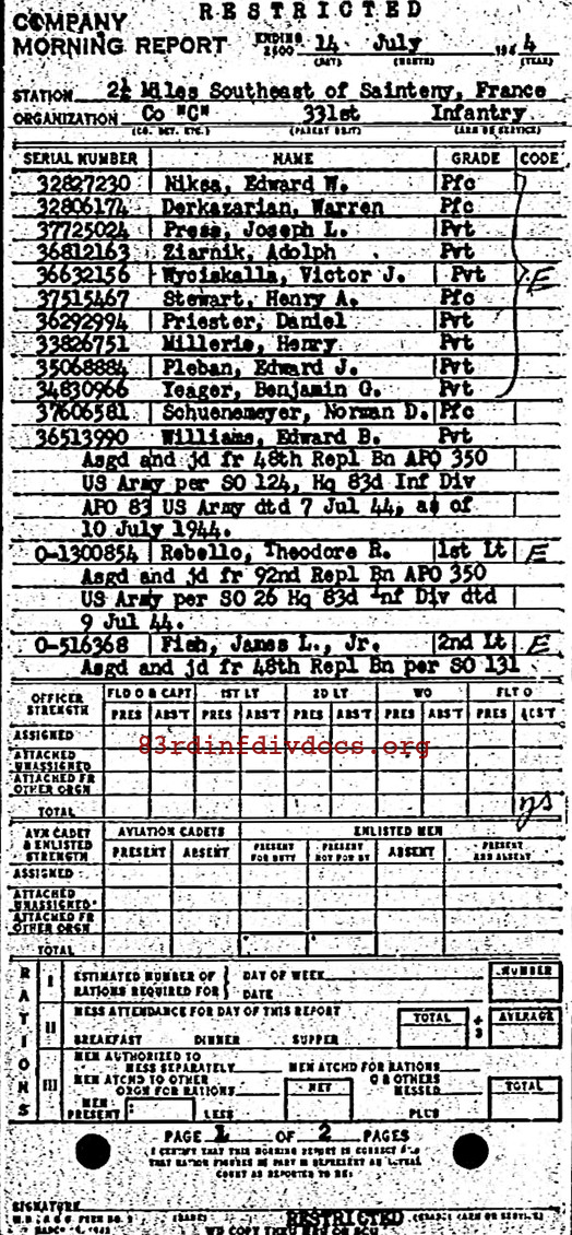| 1944-07-14 | PFC | Assigned and joined from 48th Replacement Battalion as of July 10, 1944 | C / 331 | view page | |