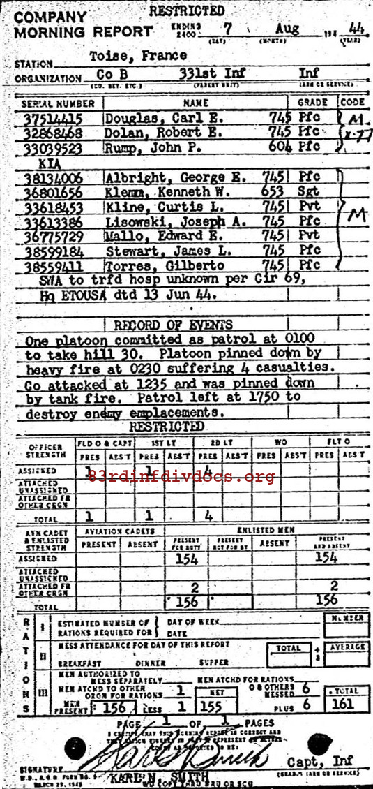 | 1944-08-07 | PFC | Killed in action on August 7, 1944 | 745 | B / 331 | view page |