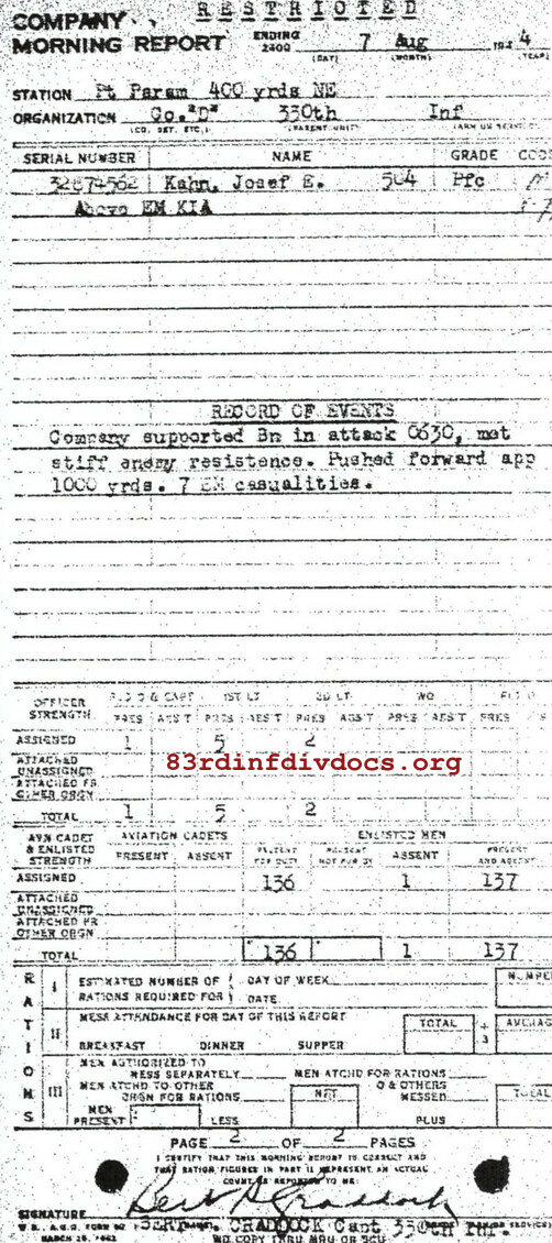 | Private First Class Kahn was a member of D Company. The morning report for August 2, 1944 on page 2 lists him joining the unit from the 41st Replacement Battalion on July 31, 1944. Page 10, for August 7, 1944 lists him as killed in action. The pages can be seen below. |
