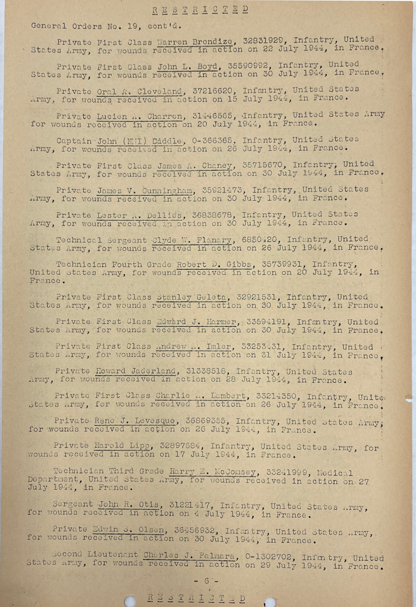 | 1944-09-05 | PFC | Lightly wounded in action and transferred to unknown hospital on August 11, 1944 | 745 | G / 329 | view page |