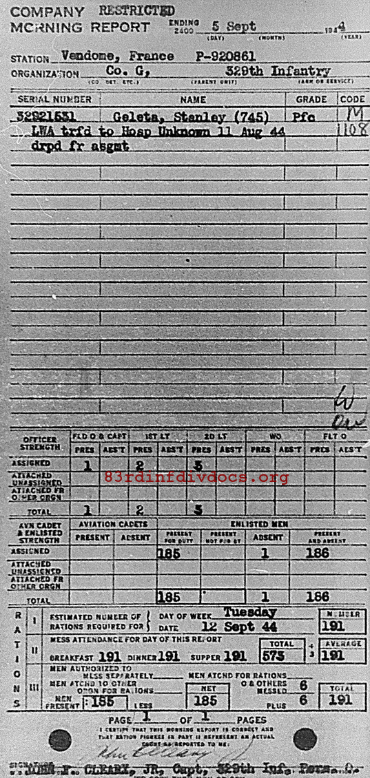 | Unit | G Company, 329th Infantry Regiment, 83rd Infantry Division |
