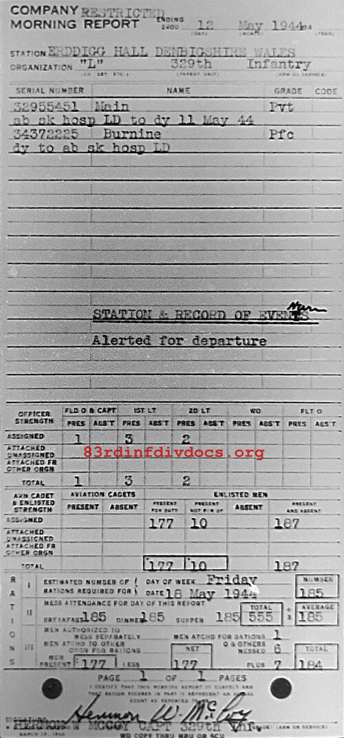 | 1944-05-12 | PVT | Non battle casualty and duty to hospital on May 11, 1944 | L / 329 | view page | |
