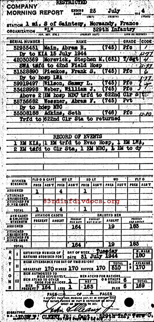 | Private First Class Main's full name is Abram Roland Main and he was a member of L Company. The morning report for July 25 1944 on page 82 lists him as killed in action on July 15, 1944. The page can be seen below. |
