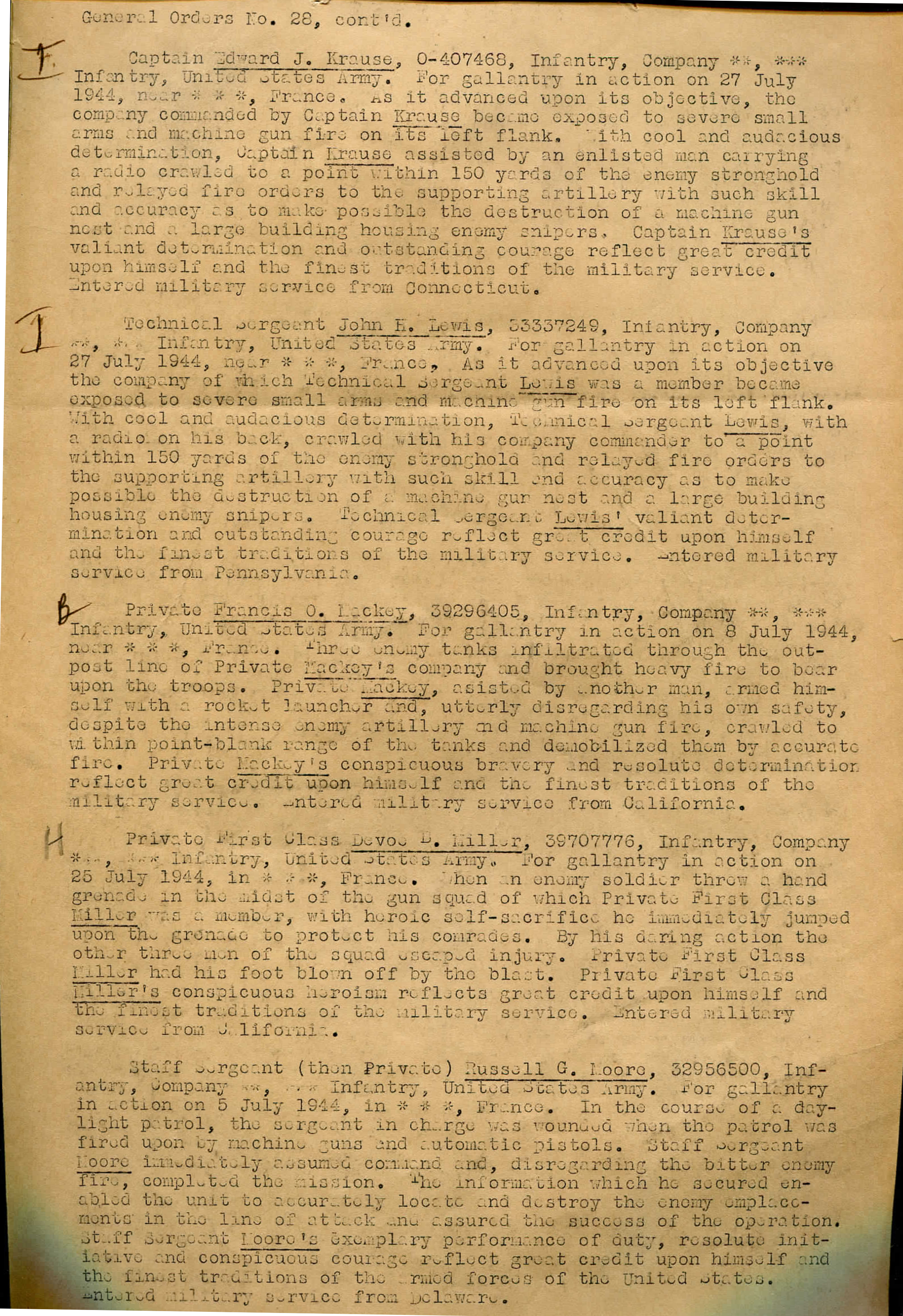 For gallantry in action on 5 July 1944, in ****, France. In the course of a daylight patrol, the sergeant in charge was wounded when the patrol was fired upon by enemy machine guns and automatic pistols. Staff Sergeant Moore immediately assumed command and, disregarding the bitter enemy fire, completed the mission. The information which he secured enabled the unit to accurately locate and destroy the enemy emplacements in the line of attack and assured the success of the operation. Staff Sergeant Moore's exemplary performance of duty, resolute initiative and conspicuous courage reflect great credit upon himself and the finest traditions of the armed forces of the United States. |