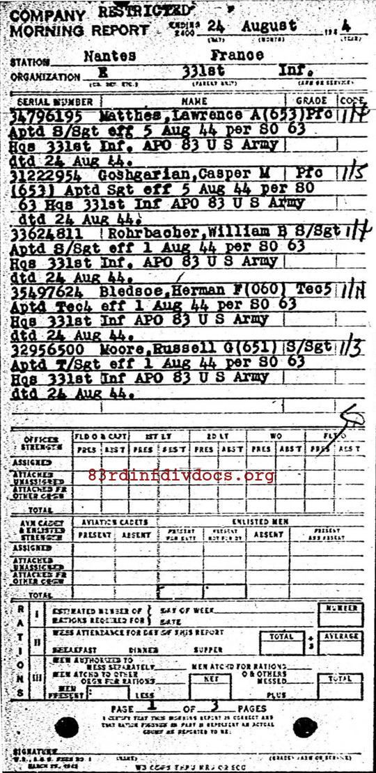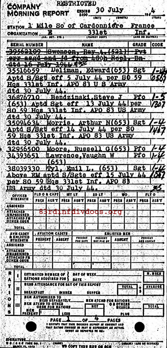 | 1944-07-30 | PFC | Promoted to Staff Sergeant, duty changed to Squad Leader (653) as of July 15, 1944 | E / 331 | view page | |