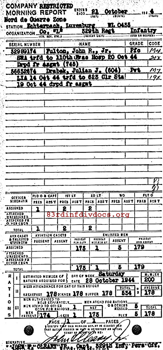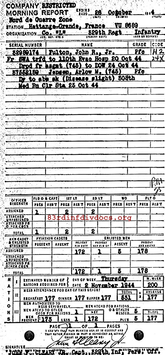 | Private First Class Fulton was a member of L Company. The morning report for October 21, 1944 on page 22 lists him as severely wounded in action and transferred to the 110th Evacuation Hospital on October 20, 1944. Page 27, for October 26, 1944 changes his status from severely wounded in action to died of wounds on October 24, 1944. All relevant pages can be seen below. |