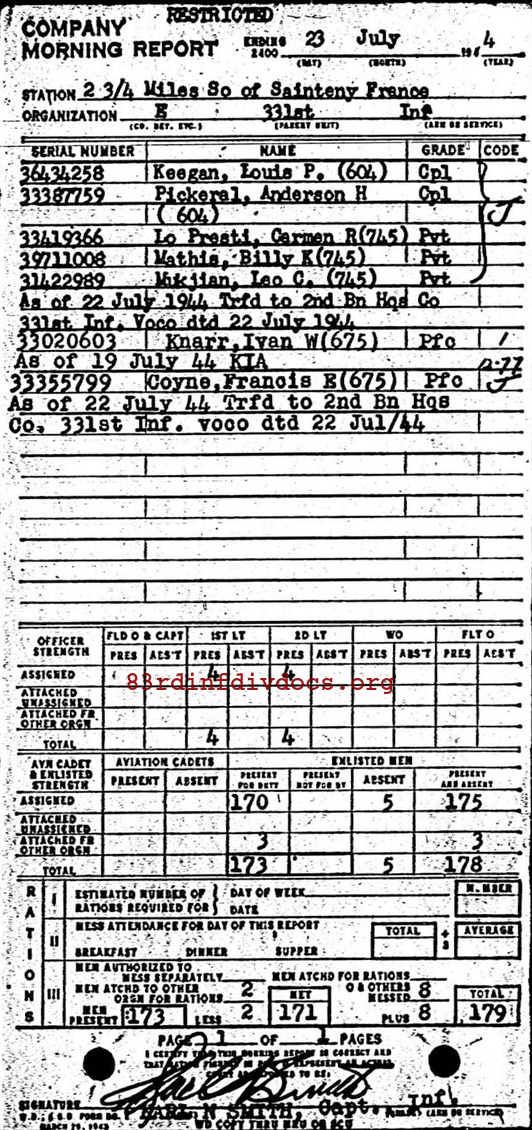 | 1944-07-23 | PFC | Killed in action on July 19, 1944 | 675 | E / 331 | view page |