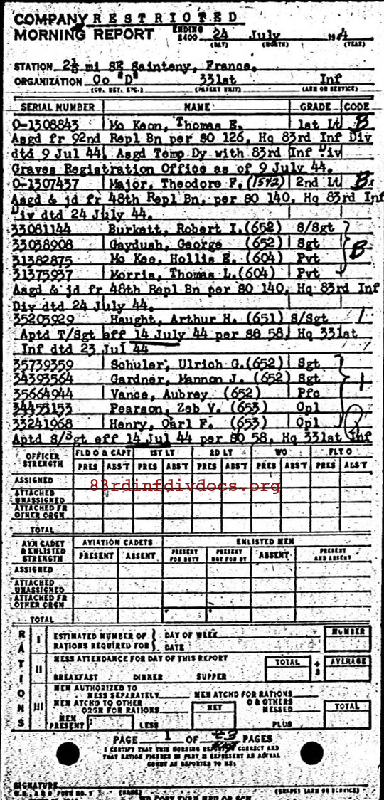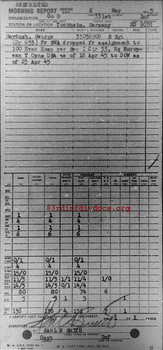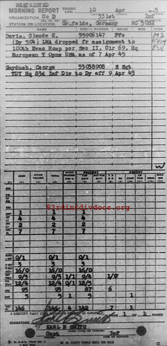 | 1945-04-10 | SSGT | Returned to duty from Divisional HQ, 83rd Infantry Division on April 9, 1945 | D / 331 | view page | |