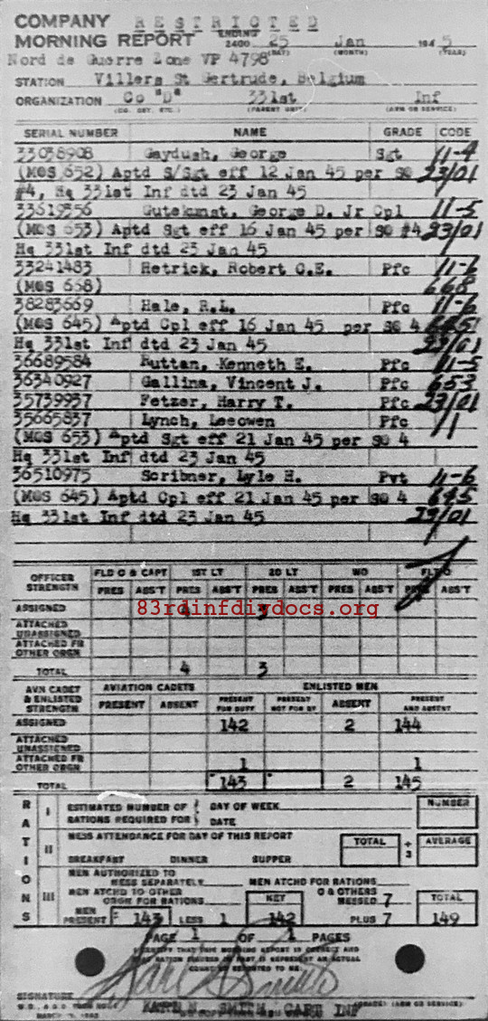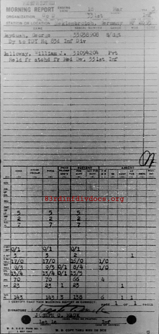 | 1945-03-18 | SSGT | Attached to Divisional HQ, 83rd Infantry Division as of March 18, 1945 | D / 331 | view page | |