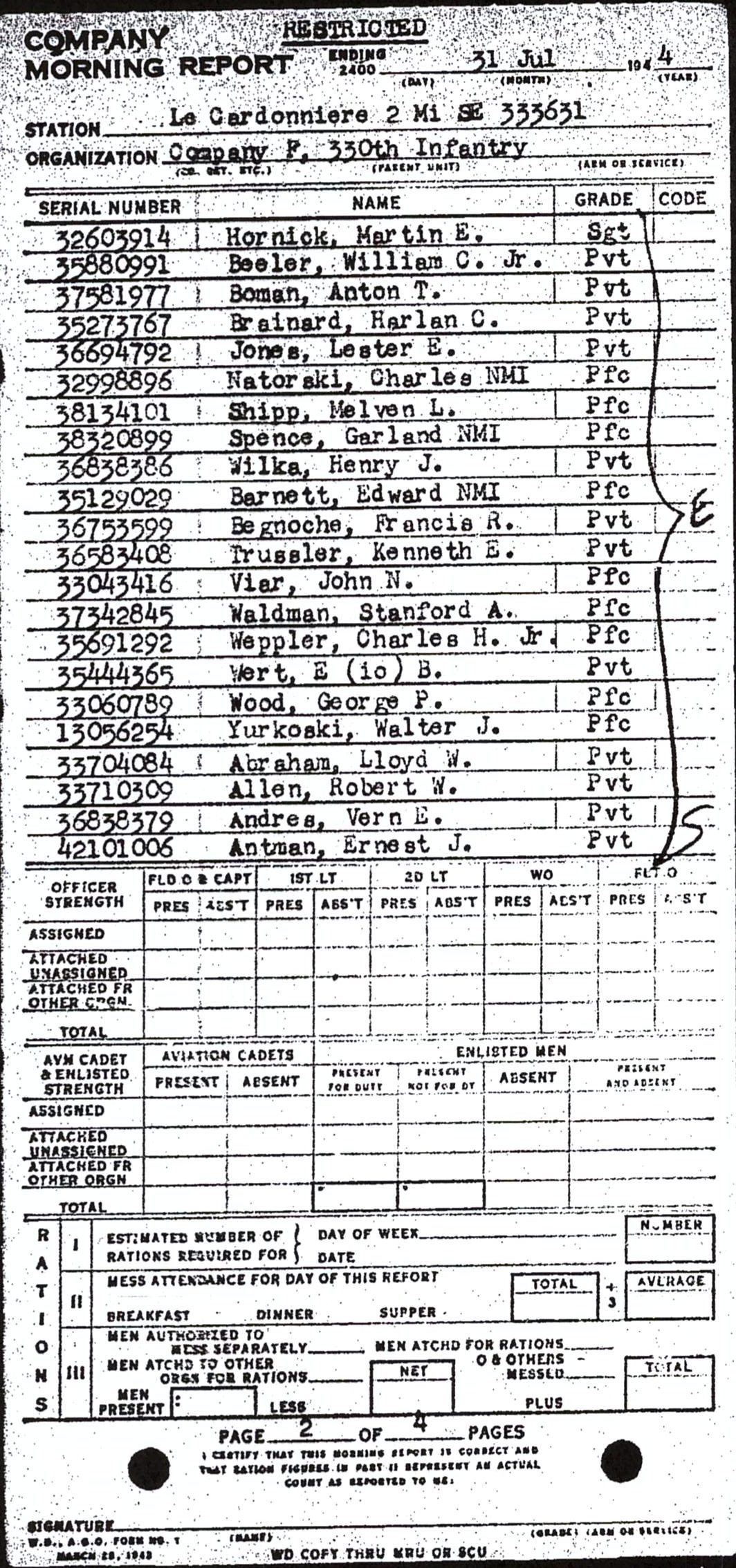 | Sergeant Wood was a member of F Company. The morning report for July 31, 1944 on pages 78 and 79 list him joining the unit from the 48th Replacement Battalion on July 30, 1944. The pages can be seen below. |