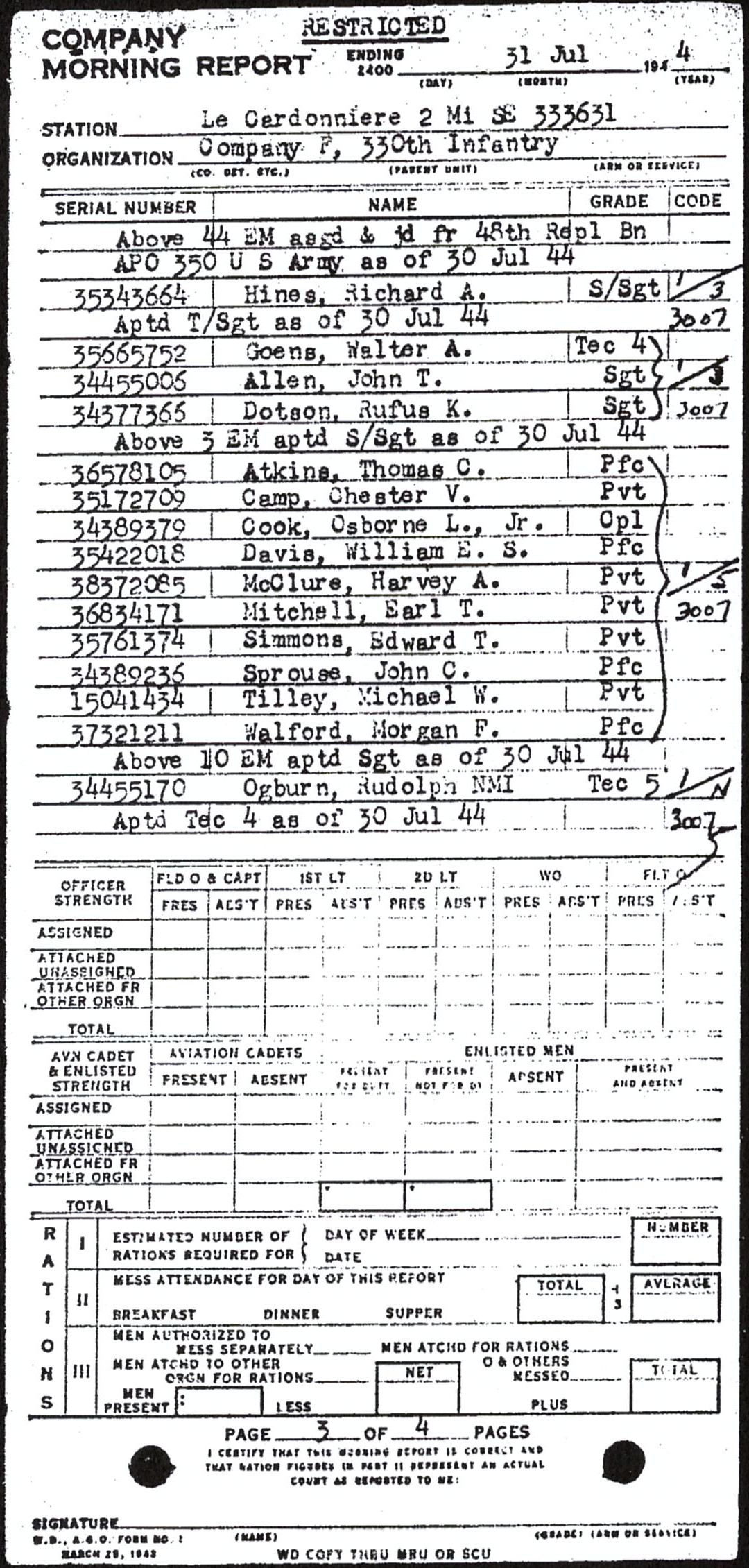 | 1944-07-31 | PFC | Assigned and joined from 48th Replacement Battalion as of July 30, 1944 | F / 330 | view page | |