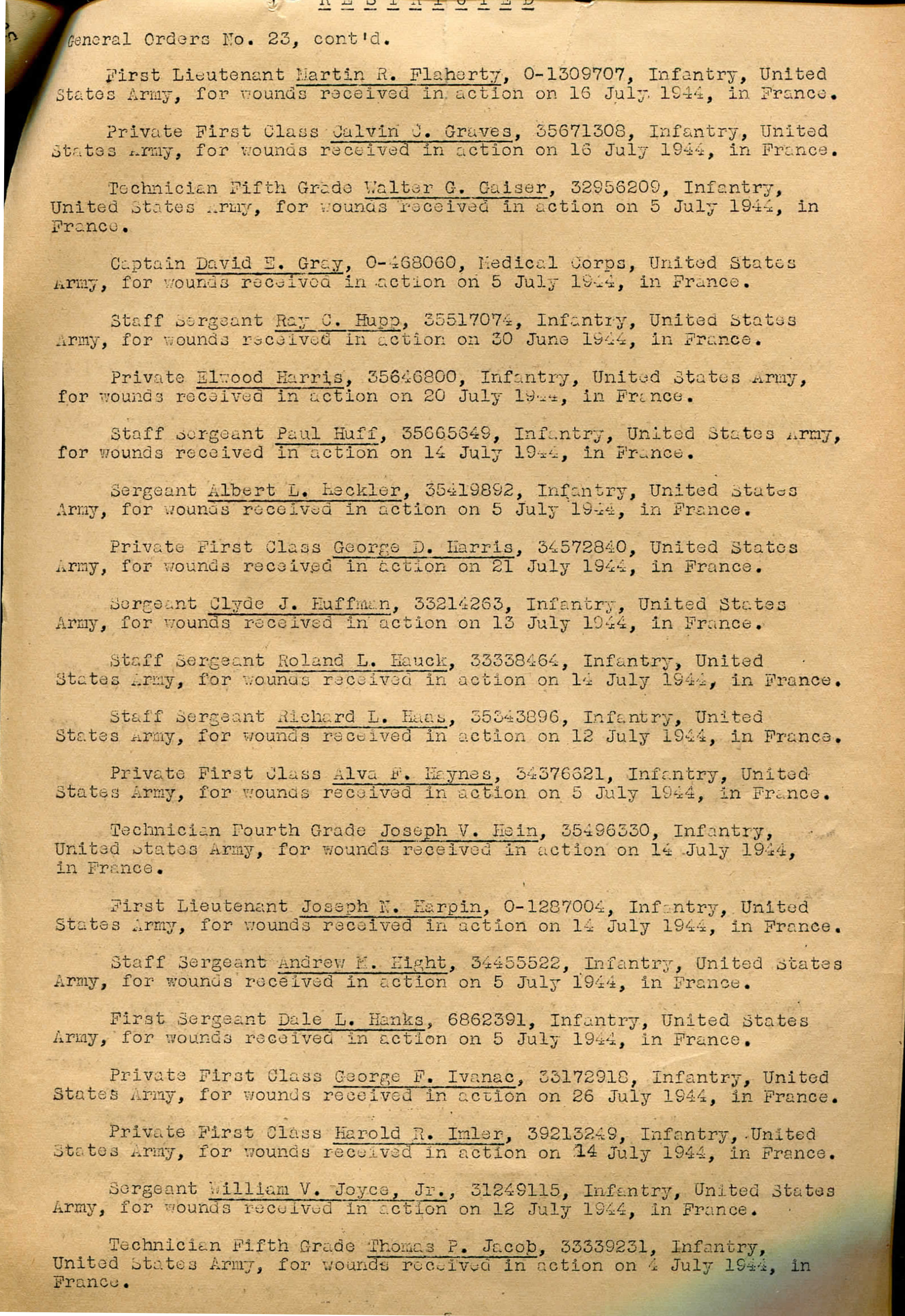 | 1945-04-03 | PFC | Died of wounds on August 9, 1944, which corrects MR of August 12, 1944 | 746 | A / 329 | view page |
