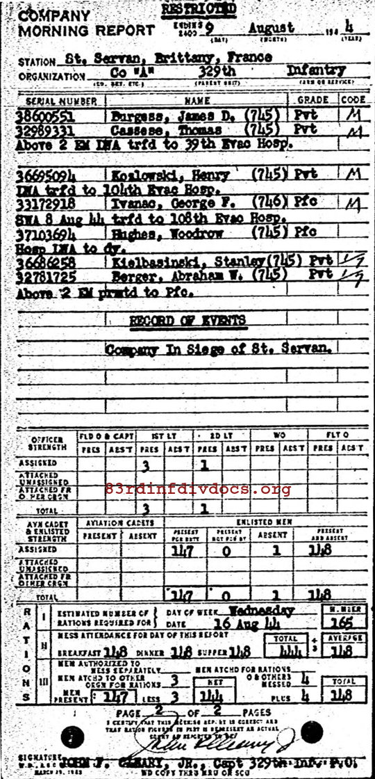 | 1944-08-09 | PFC | Severely wounded in action and transferred to 108th Evacuation Hospital on August 8, 1944 | 746 | A / 329 | view page |