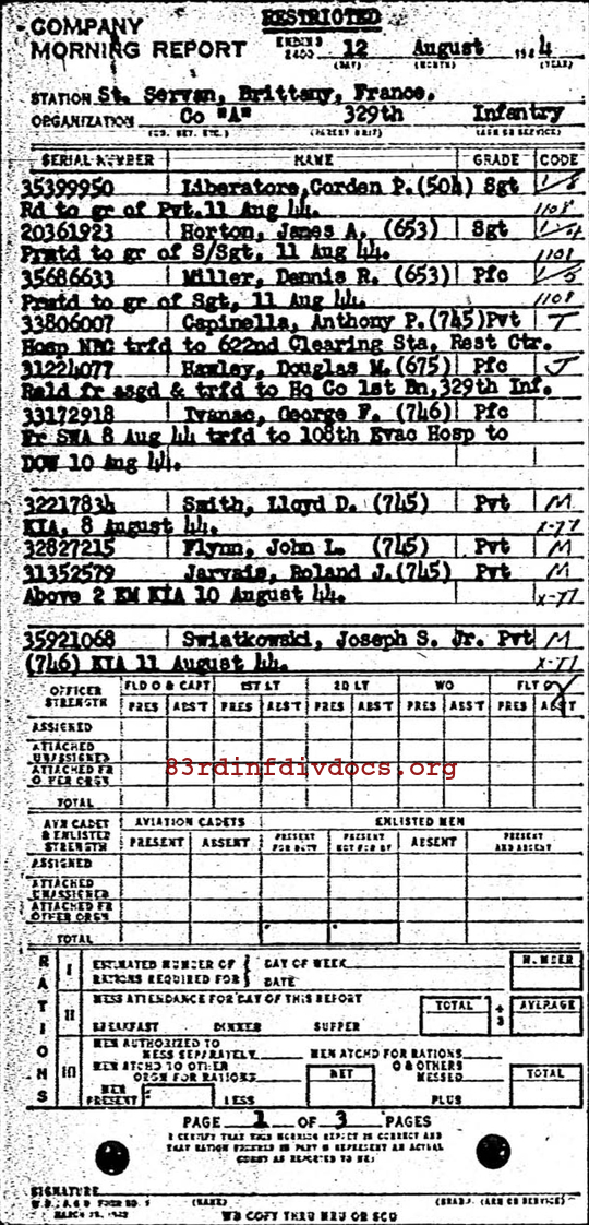 | Private First Class Ivanac was a member of A Company. The morning report for August 9, 1944 on page 12 shows him severely wounded in action on August 8, 1944 and evacuated to the 108th Evacuation Hospital. Page 15 in the same morning report changes his status to died of wounds on August 10, 1944 which actually conflicts with the date registered with ABMC. Both pages can be seen below. General Order 23 lists his commendation for a Purple Heart for wounds received in action on July 26, 1944. |