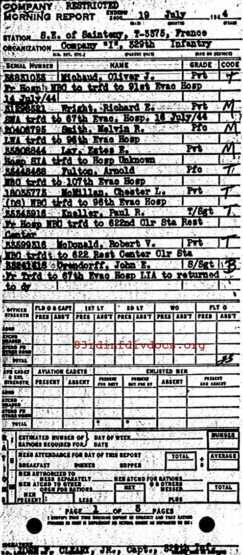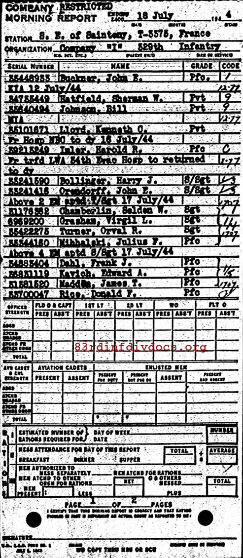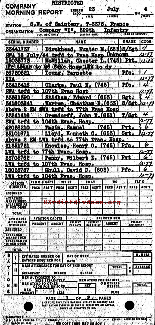 | 1944-07-23 | TSGT | Severely wounded in action and transferred to 104th Evacuation Hospital on July 23, 1944 | 651 | I / 329 | view page |