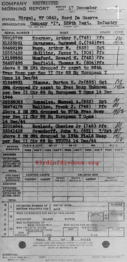 | 1944-12-17 | TSGT | Severely wounded in action and transferred to 13th Field Hospital on December 14, 1944 | 651 | I / 329 | view page |
