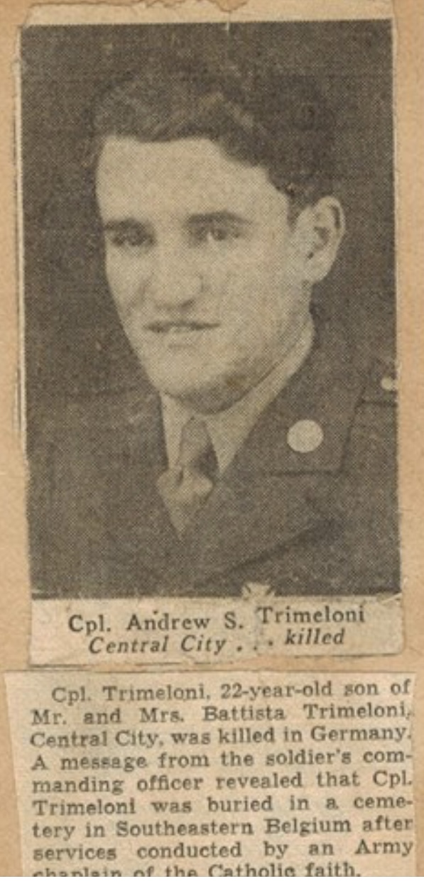 | Technician Fifth Grade Trimeloni was a member of Headquarters Company, 3rd Battalion. The morning report for December 8, 1944 on page 8 lists him as killed in action on December 7, 1944. The page can be seen below. |