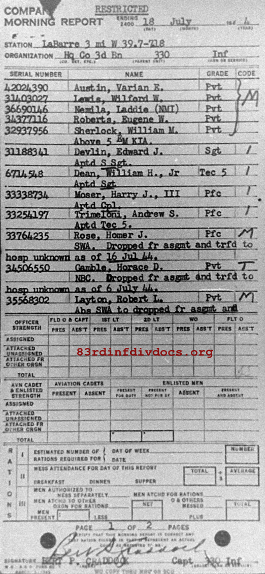 | 1944-07-18 | PFC | Promoted to Technician Fifth Grade as of July 18, 1944 | HQCO3BN / 330 | view page | |