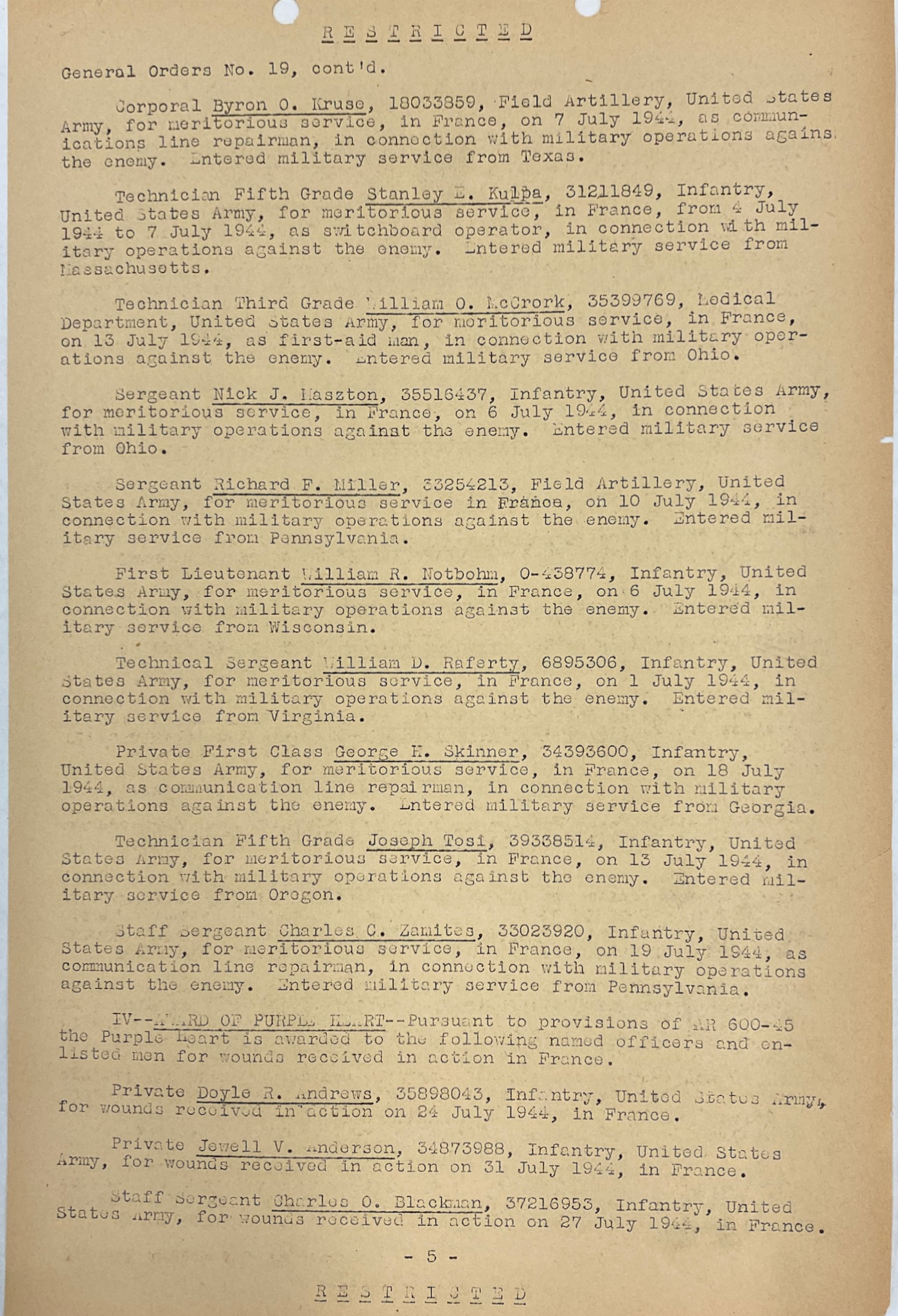 | Listed in HQ 908th Field Artillery Battalion, History 1944: Awarded a Bronze Star (Posthumous) for distinguishing himself by meritorious service in Sainteny, France on July 10, 1944 as a Sergeant in 908FA | 13 | ||||