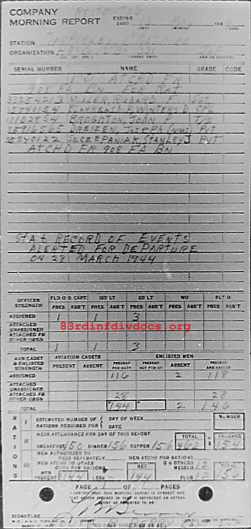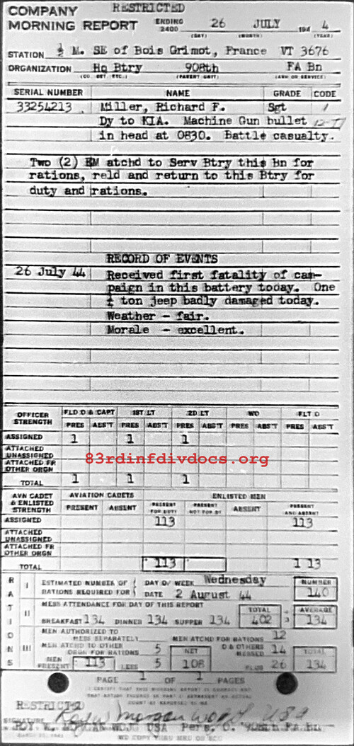 | 1944-07-26 | SGT | Listed in Record of Events for July 26, 1944 | HQ / 908FA | view page | |