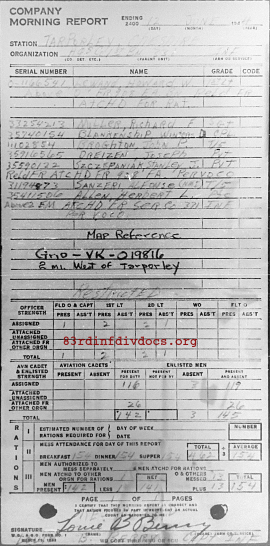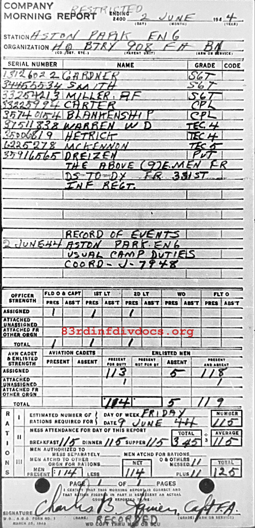 | Unit | HQ Btry, 908th Field Artillery Battalion, 83rd Infantry Division |