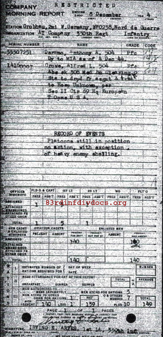 | Private First Class Deramo was a member of the Anti Tank Company. The morning report for December 8, 1944 on page 8 lists his status changed to missing in action as of December 4, 1944. Page 17, for December 17, 1944, changes his status into killed in action him as killed in action on December 4, 1944. The pages can be seen below. |