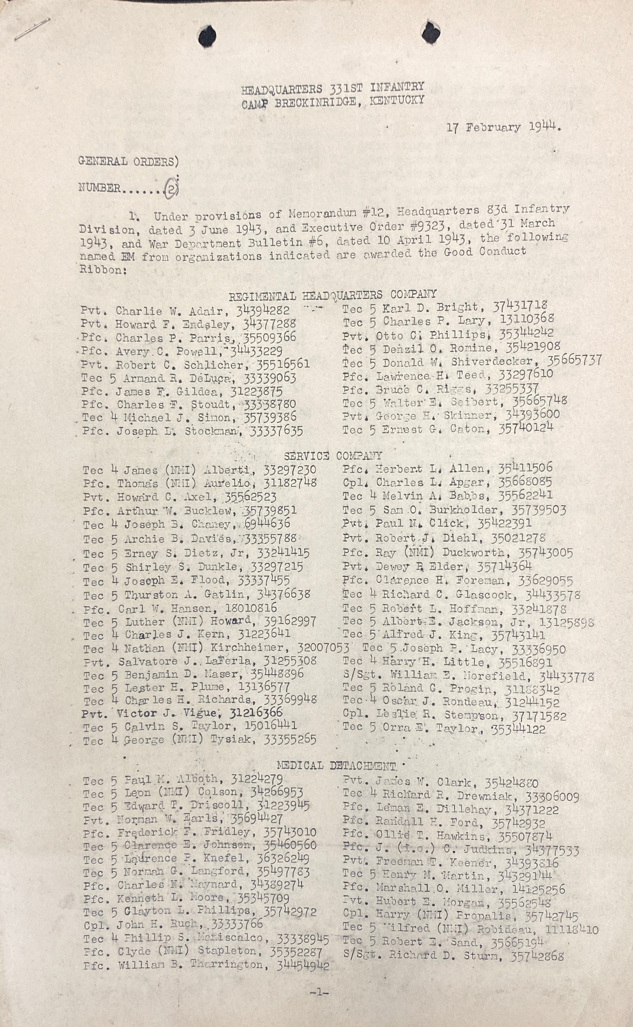 | 1944-04-27 | TEC4 | Attached from Medical Detachment, 331st Infantry Regiment as of April 27, 1944 | B / 331 | view page | |