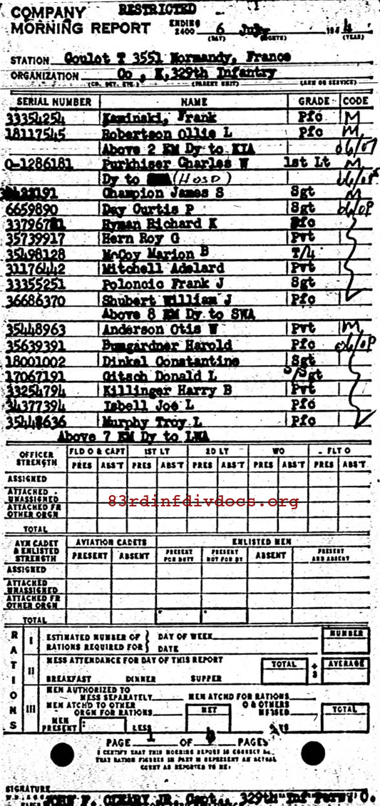 | Unit | K Company, 329th Infantry Regiment, 83rd Infantry Division |