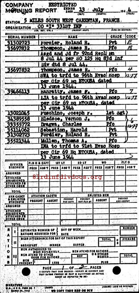 Lightly wounded in action and transferred to 91st Evacuation Hospital on July 13, 1944 |
