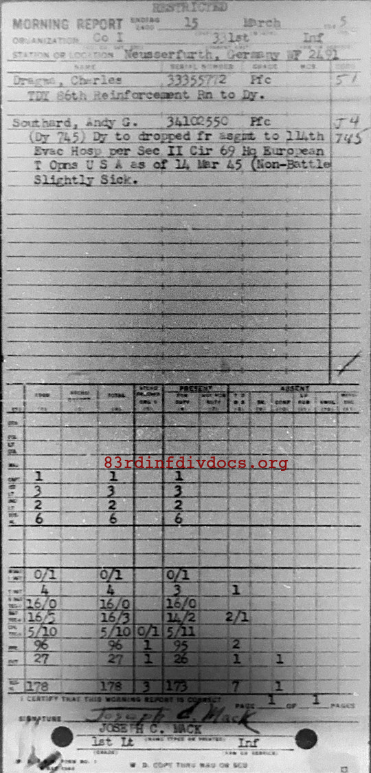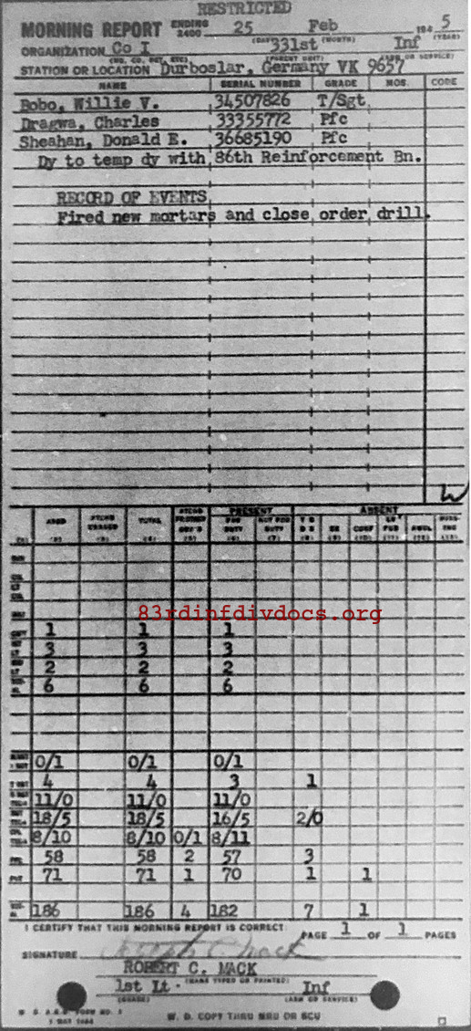 Released from attachment from I Company, 331st Infantry Regiment on March 15, 1945 |